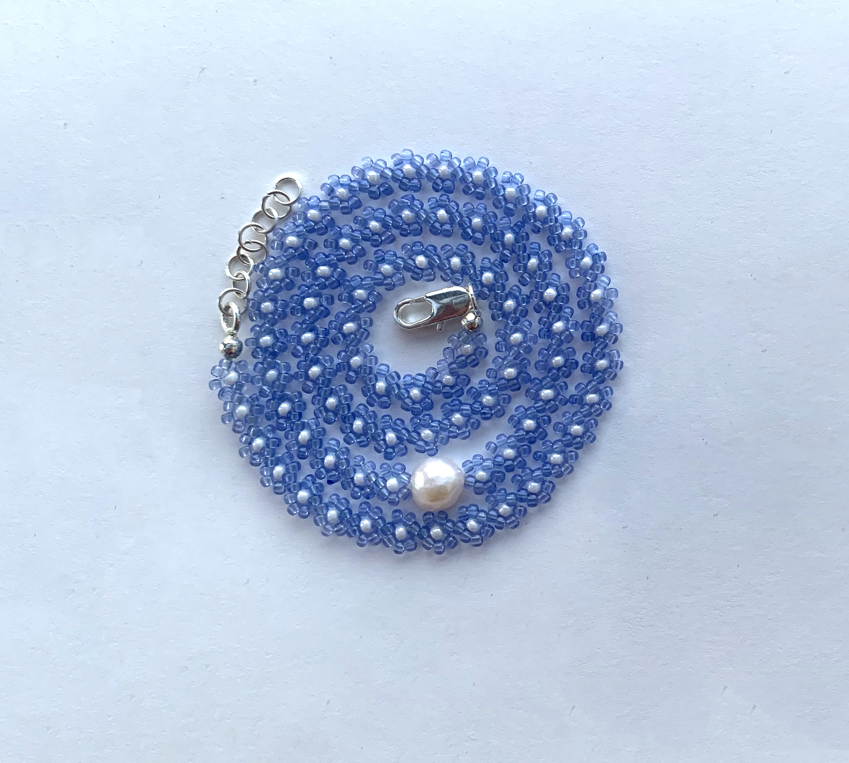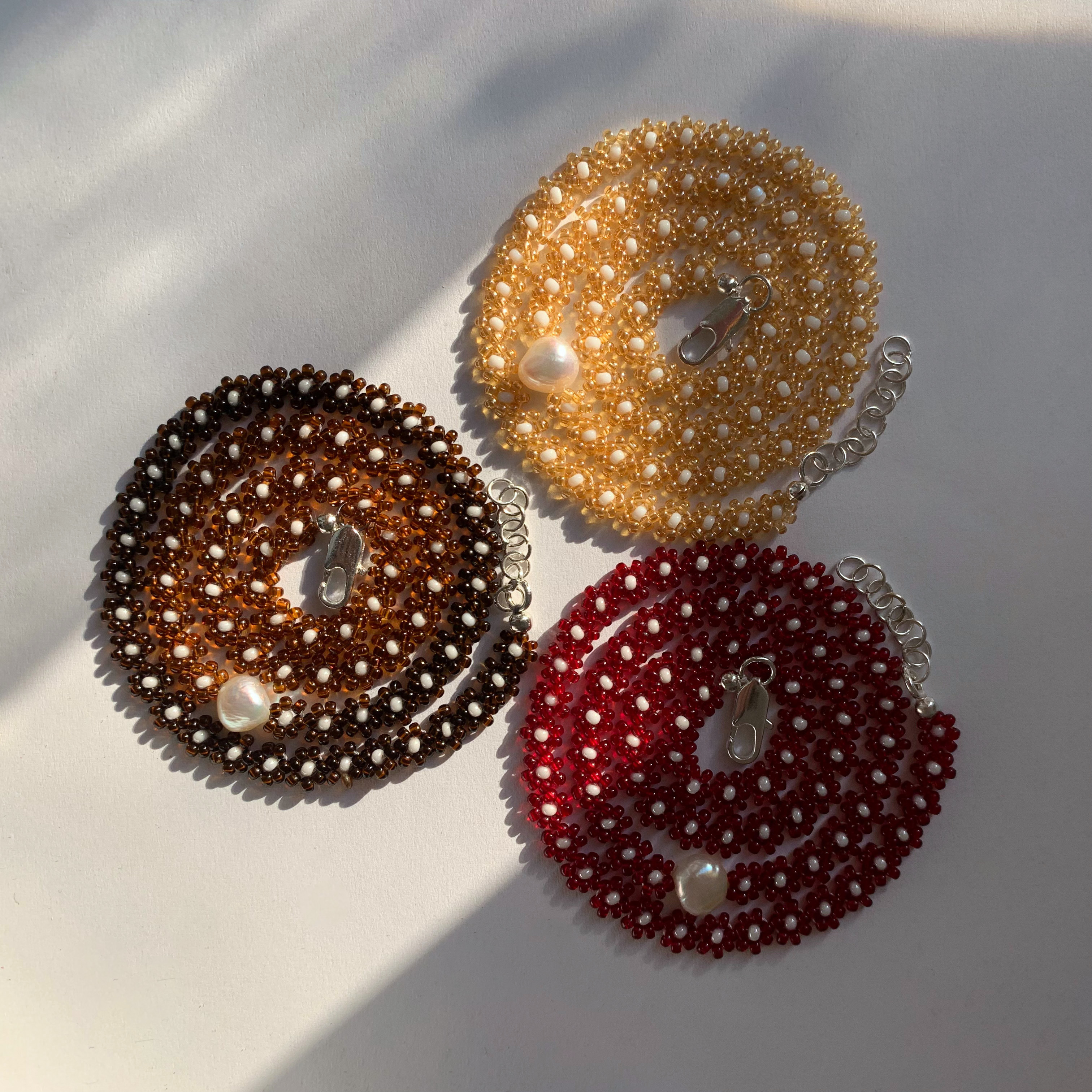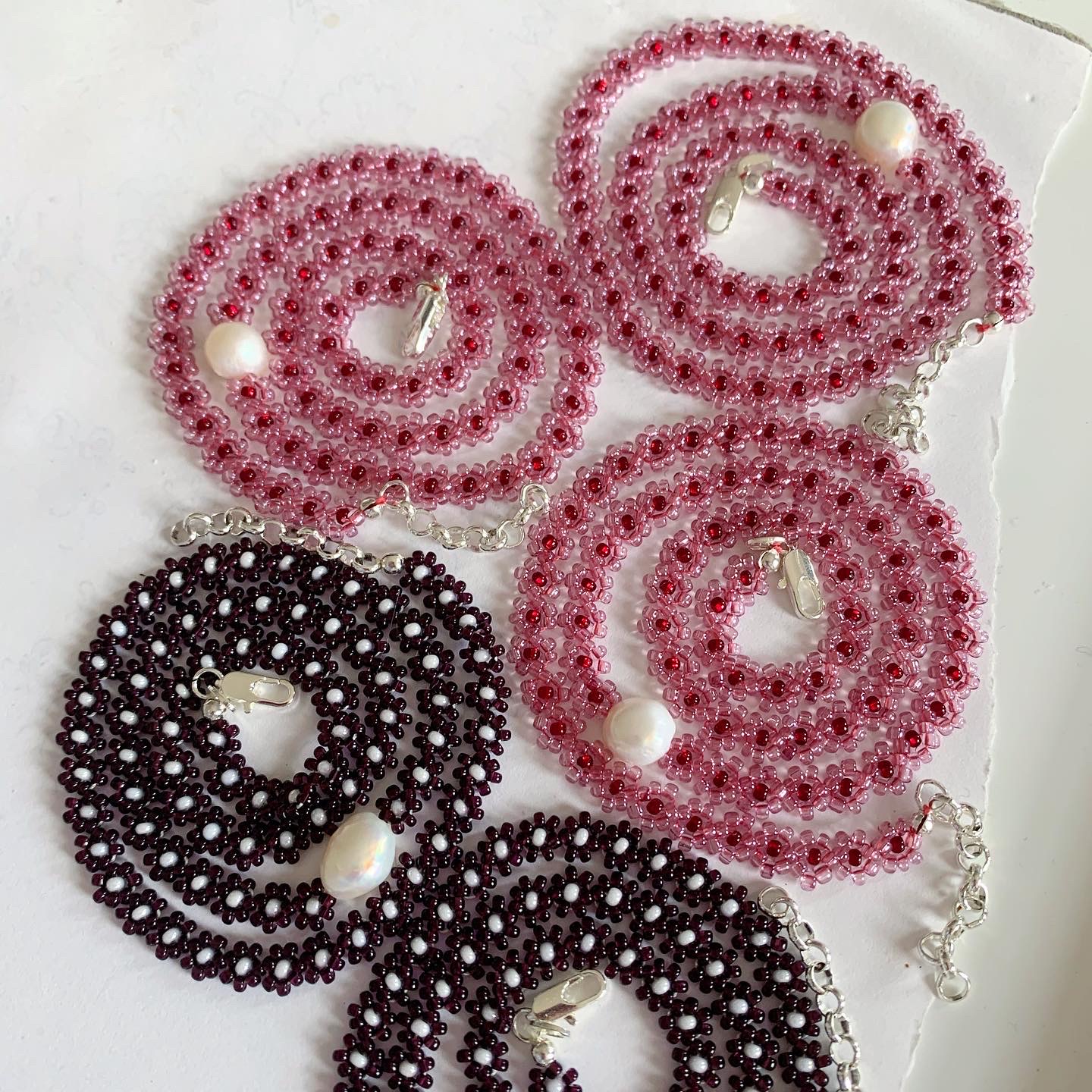Daintier but still intricate, these chains are hand beaded with glass beads, fresh water pearls and finished with silver plated hardware. Made to order as always.