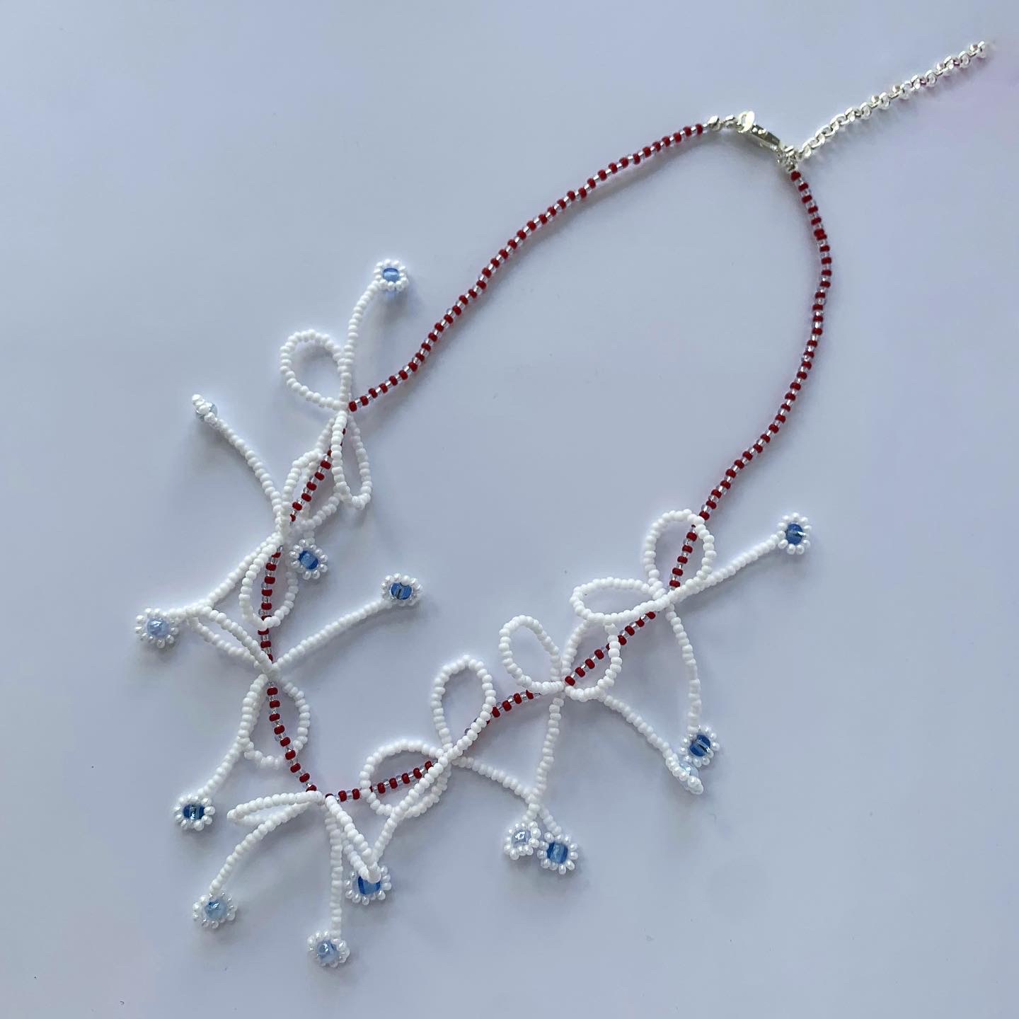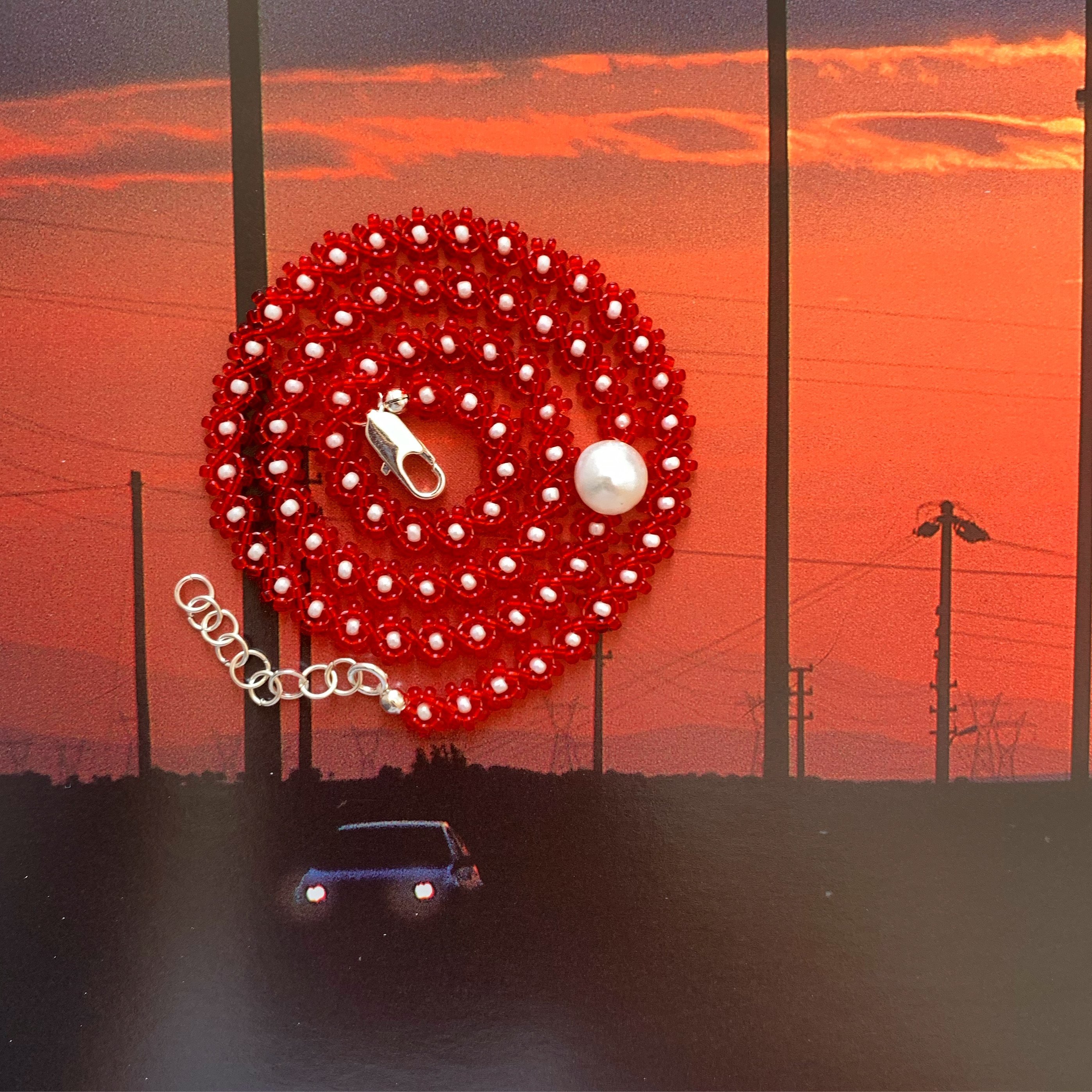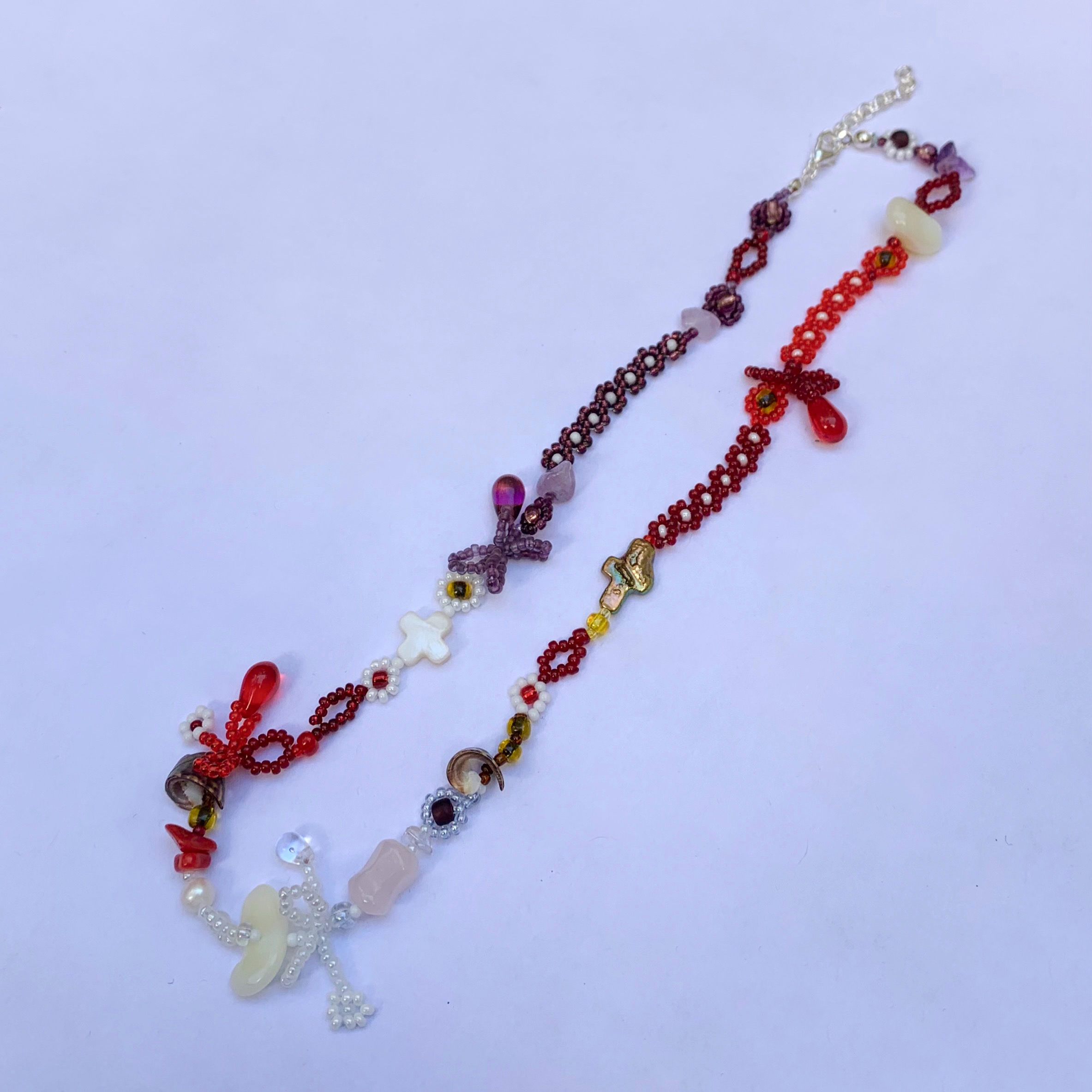 Daintier but still intricate, these chains are hand beaded with glass beads, fresh water pearls and finished with silver plated hardware. Made to order as always.