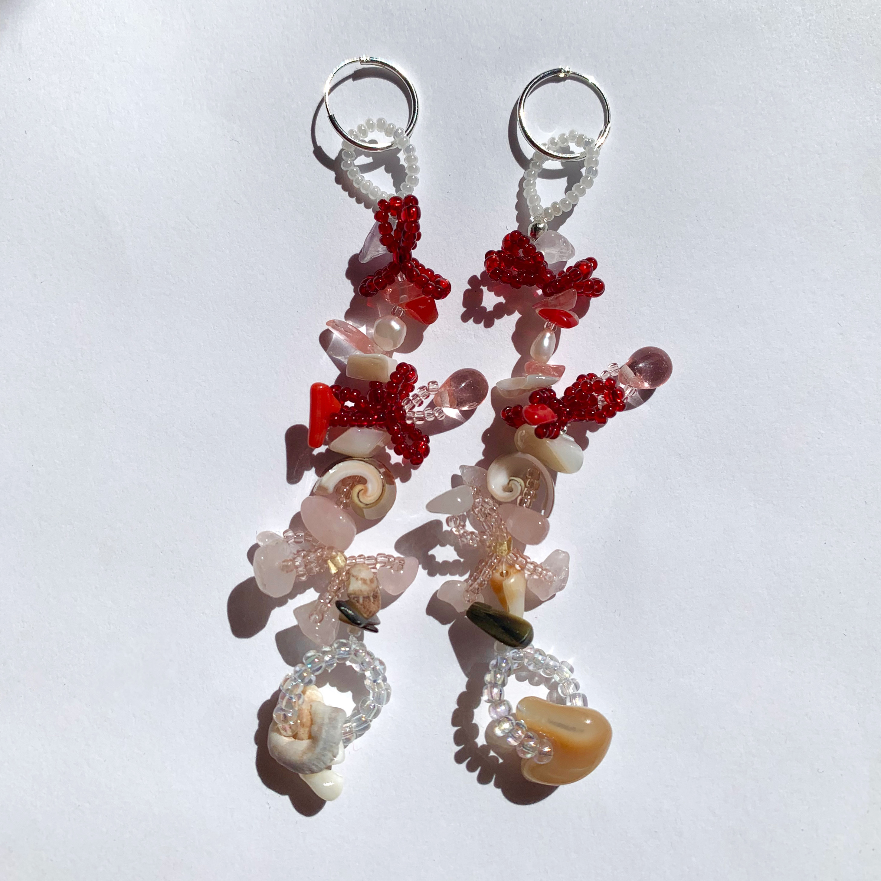 Each piece is hand beaded to order. Materials include glass beads, collected shells, semi precious stones, and pearls. Sterling silver hoops. Individual beads may vary per order depending on availability.