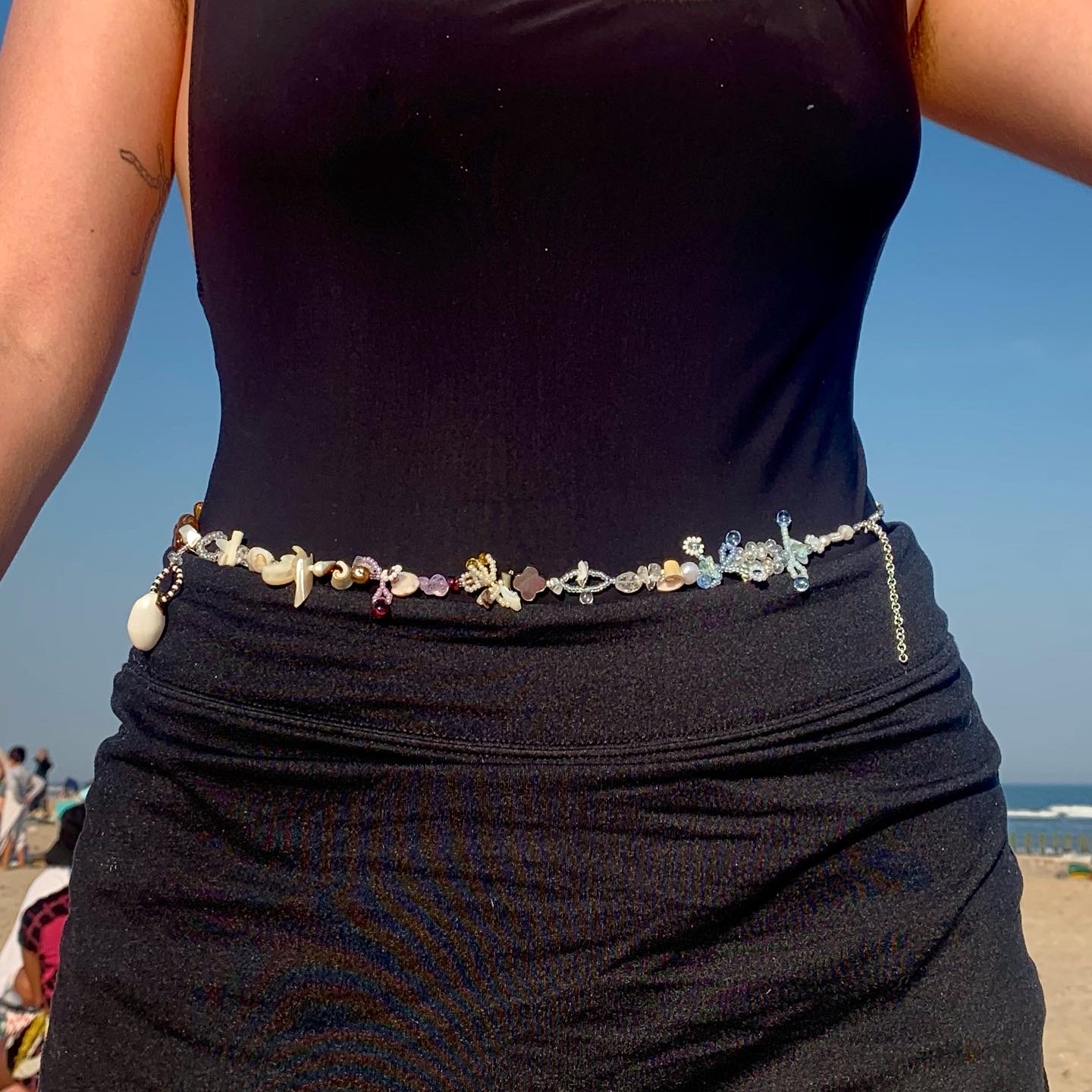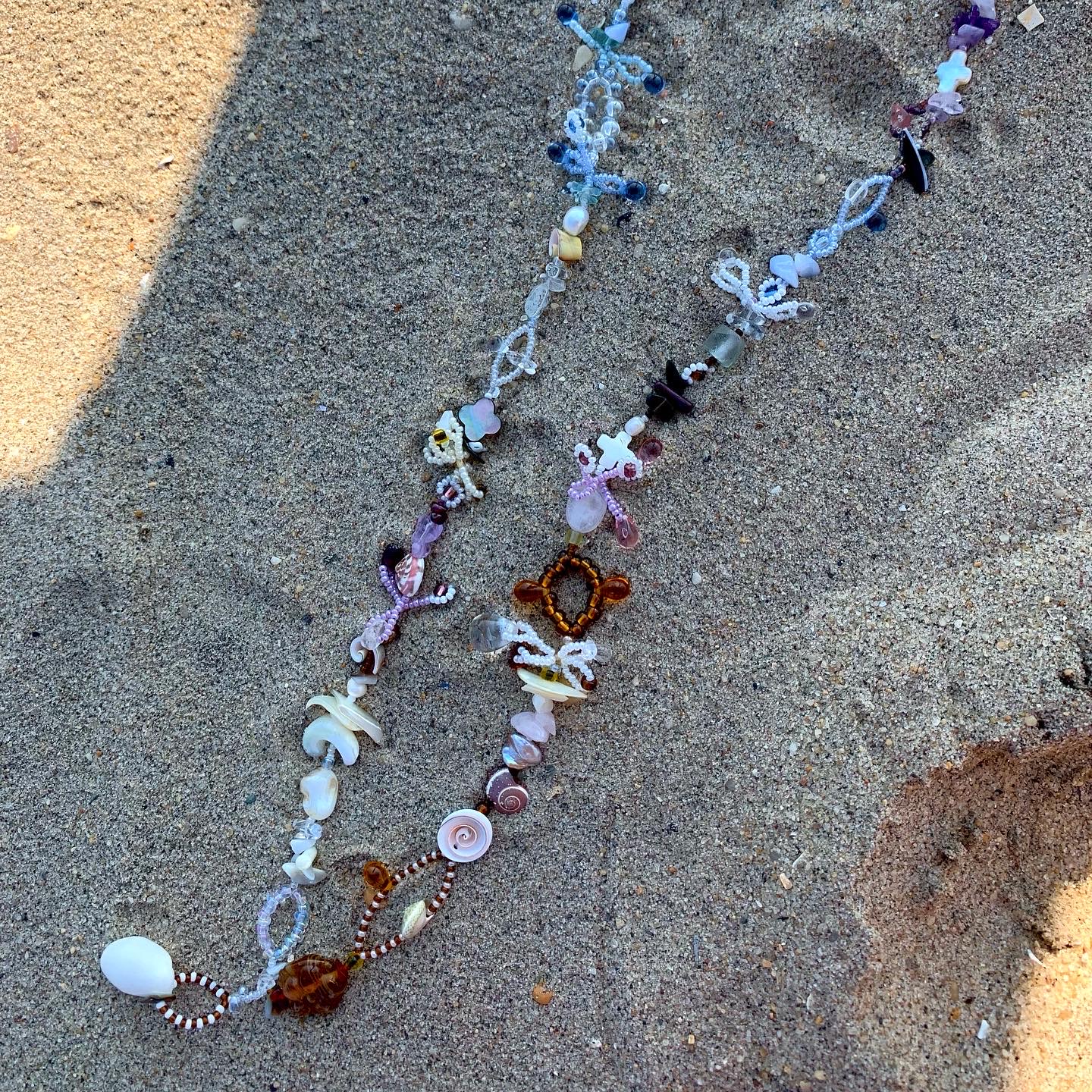 Each piece is hand beaded to order. Materials include glass beads, collected shells, semi precious stones, and pearls. Silver plated hardware. Individual beads may vary per order depending on availability.
